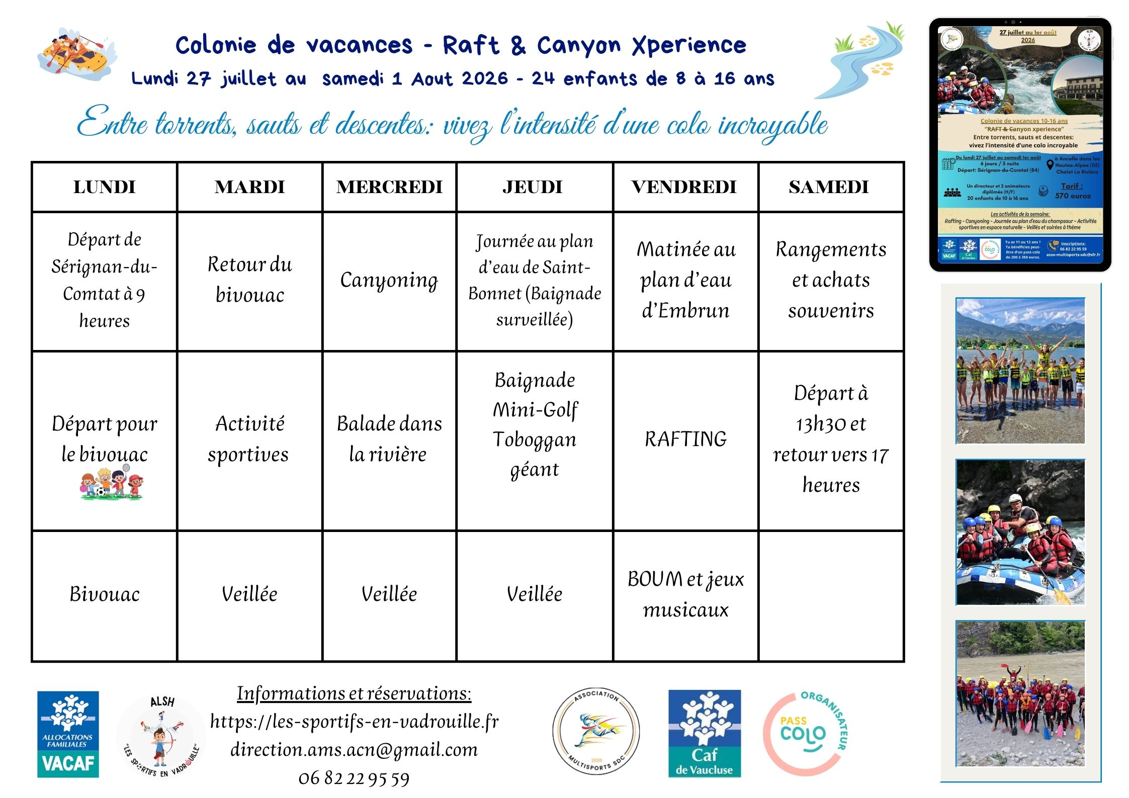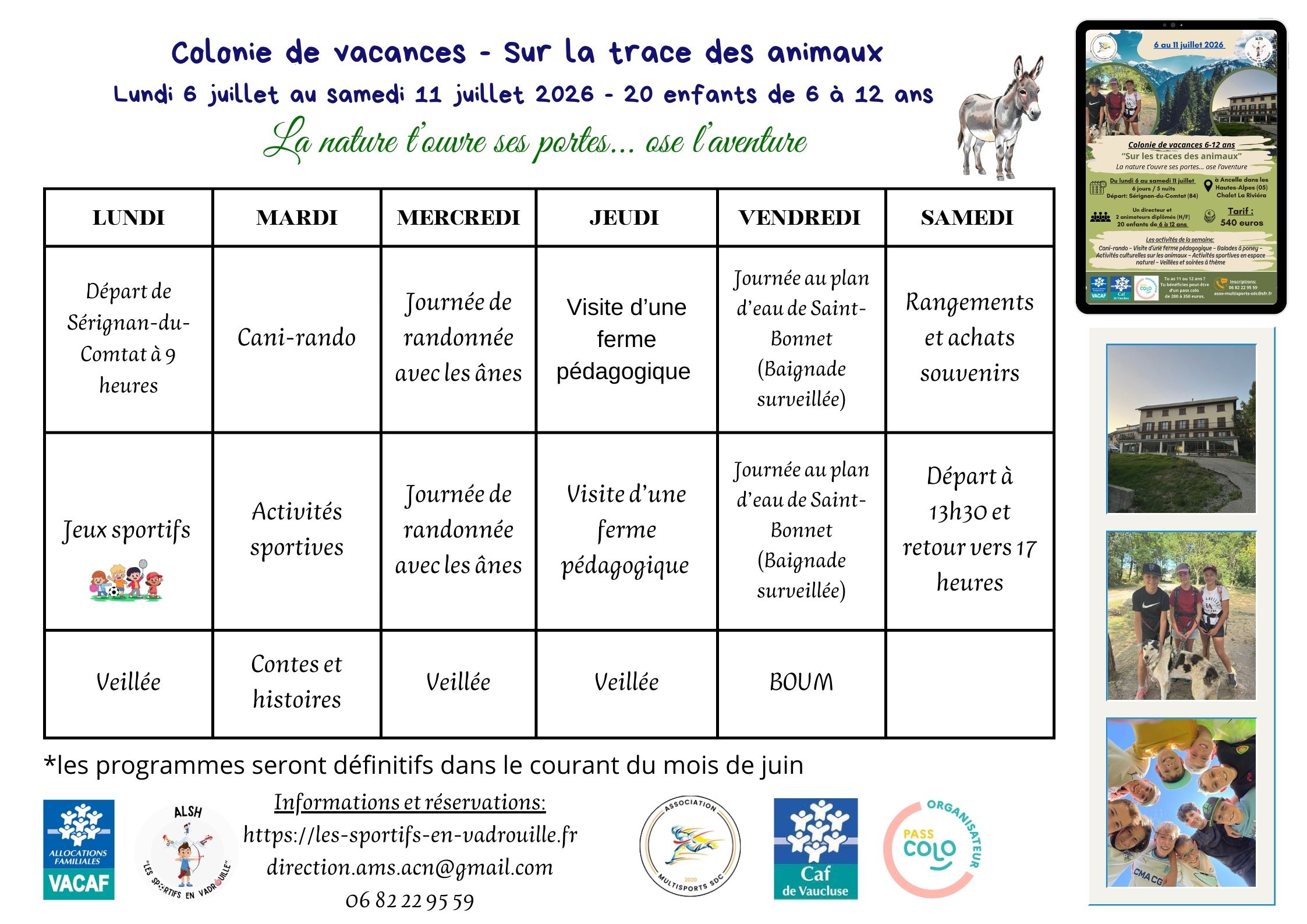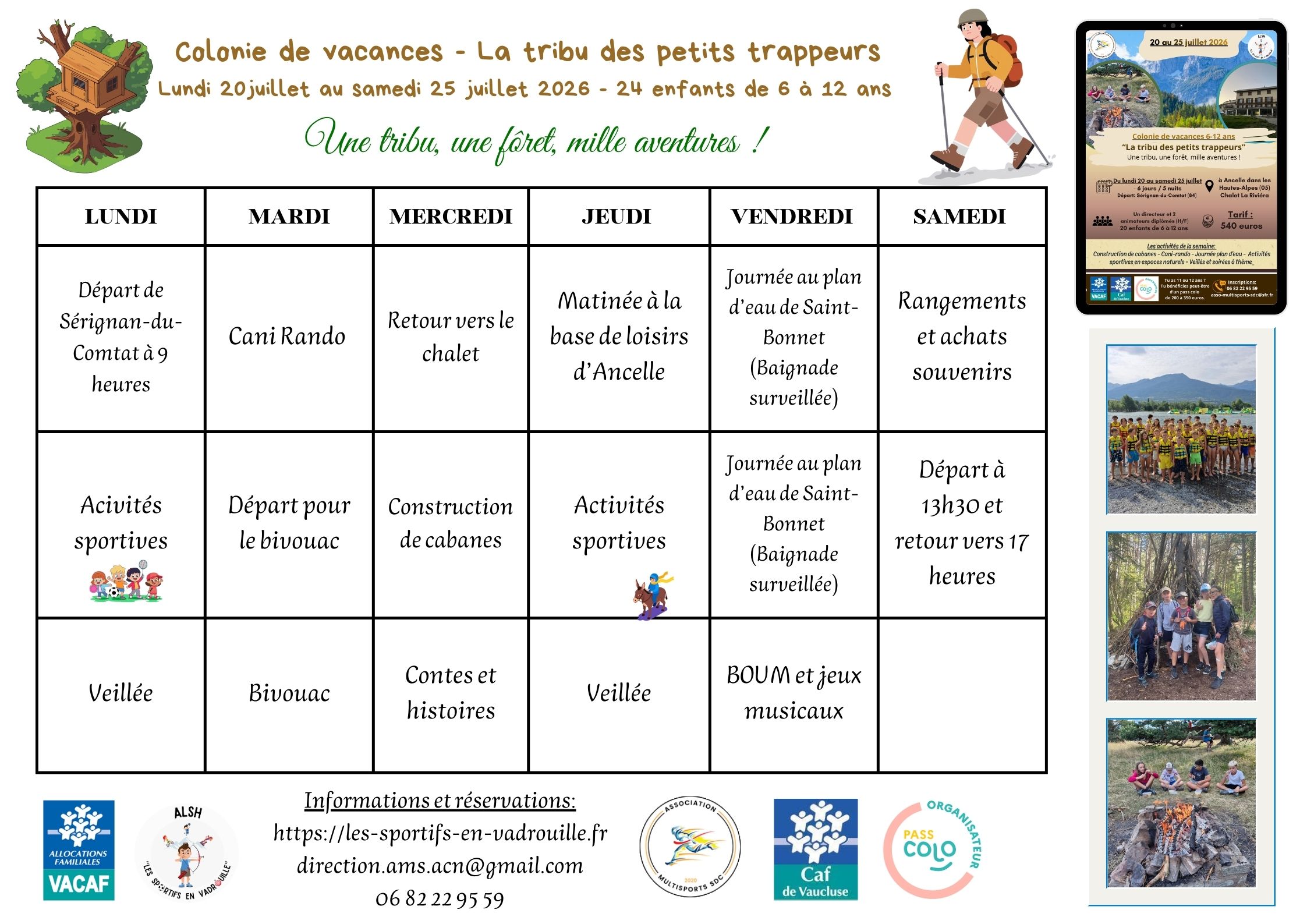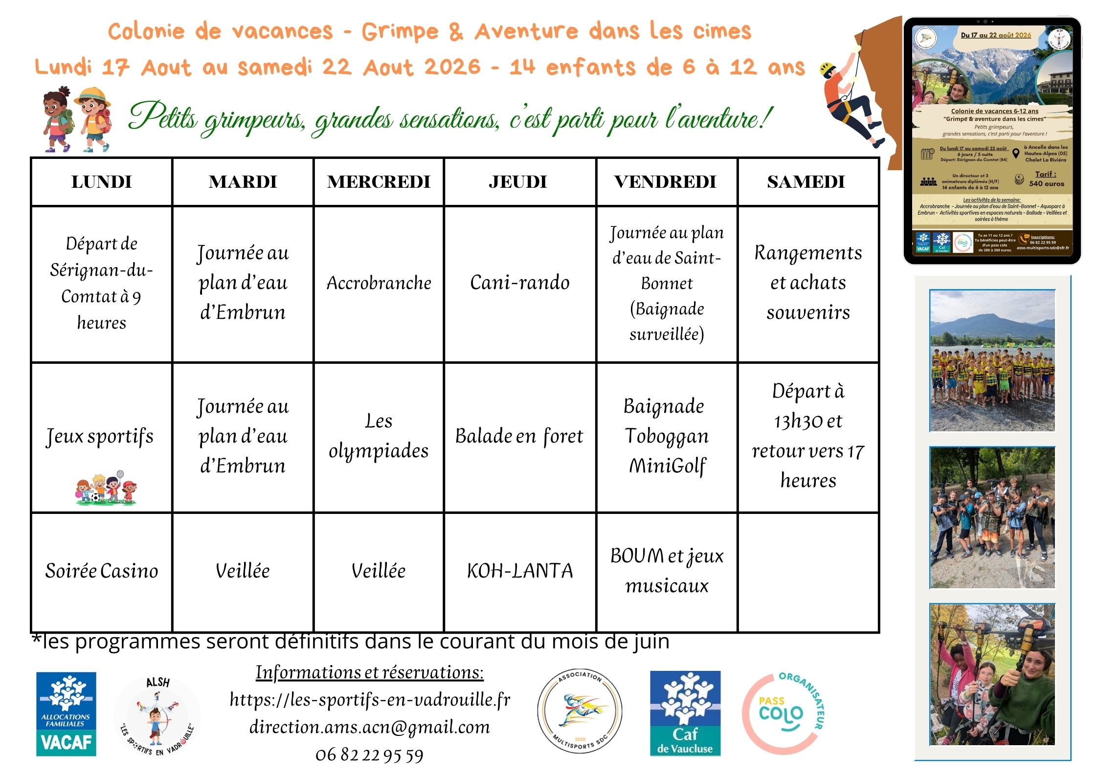 Du lundi 17 au samedi 22 août 2026 pour les enfants de 6 à 12 ans.