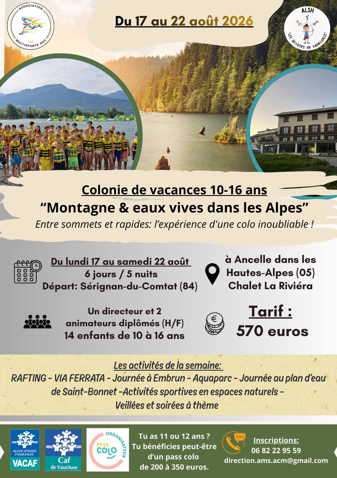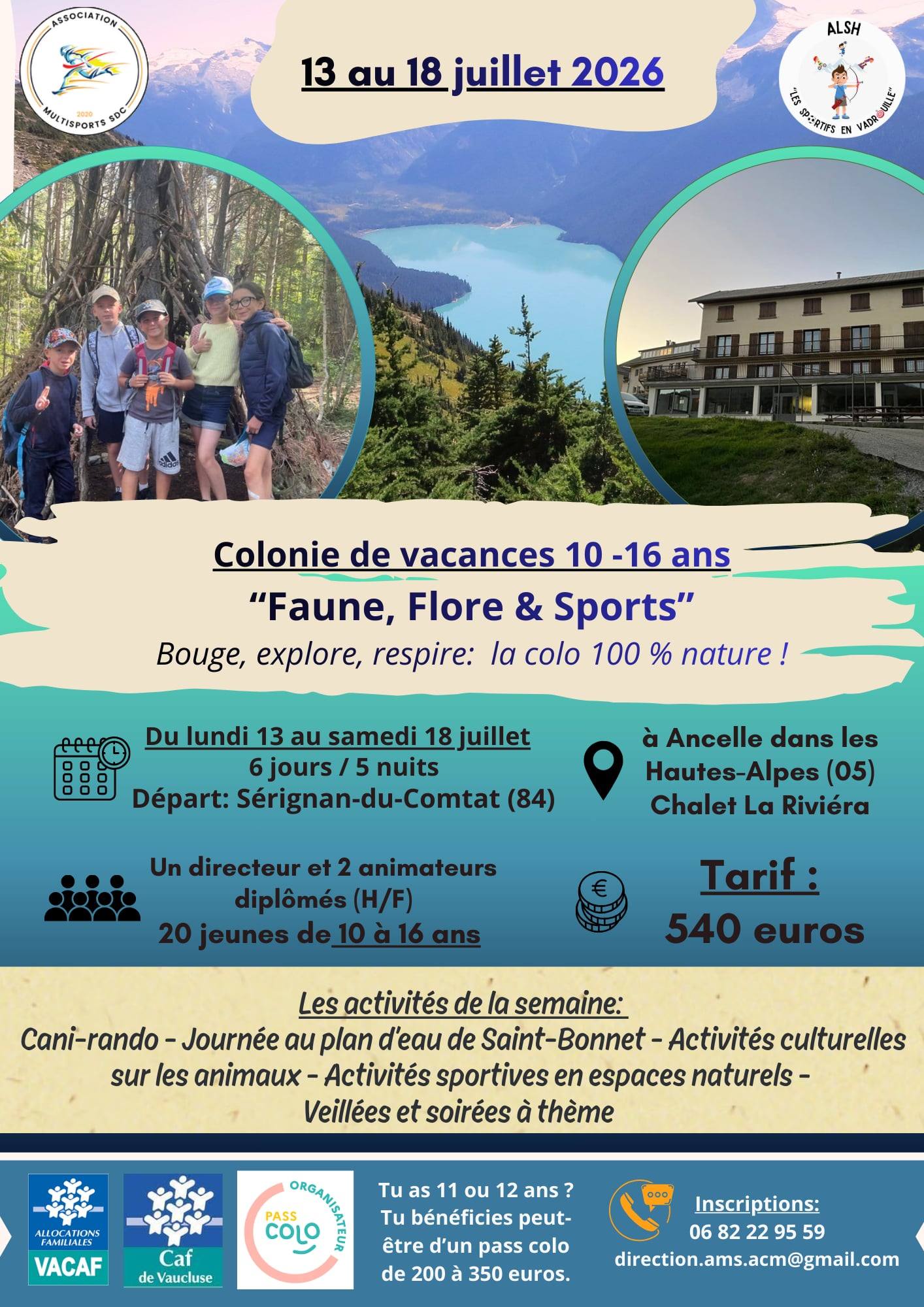 Du lundi 17 au samedi 22 août 2026 pour les enfants de 10 à 16 ans.
