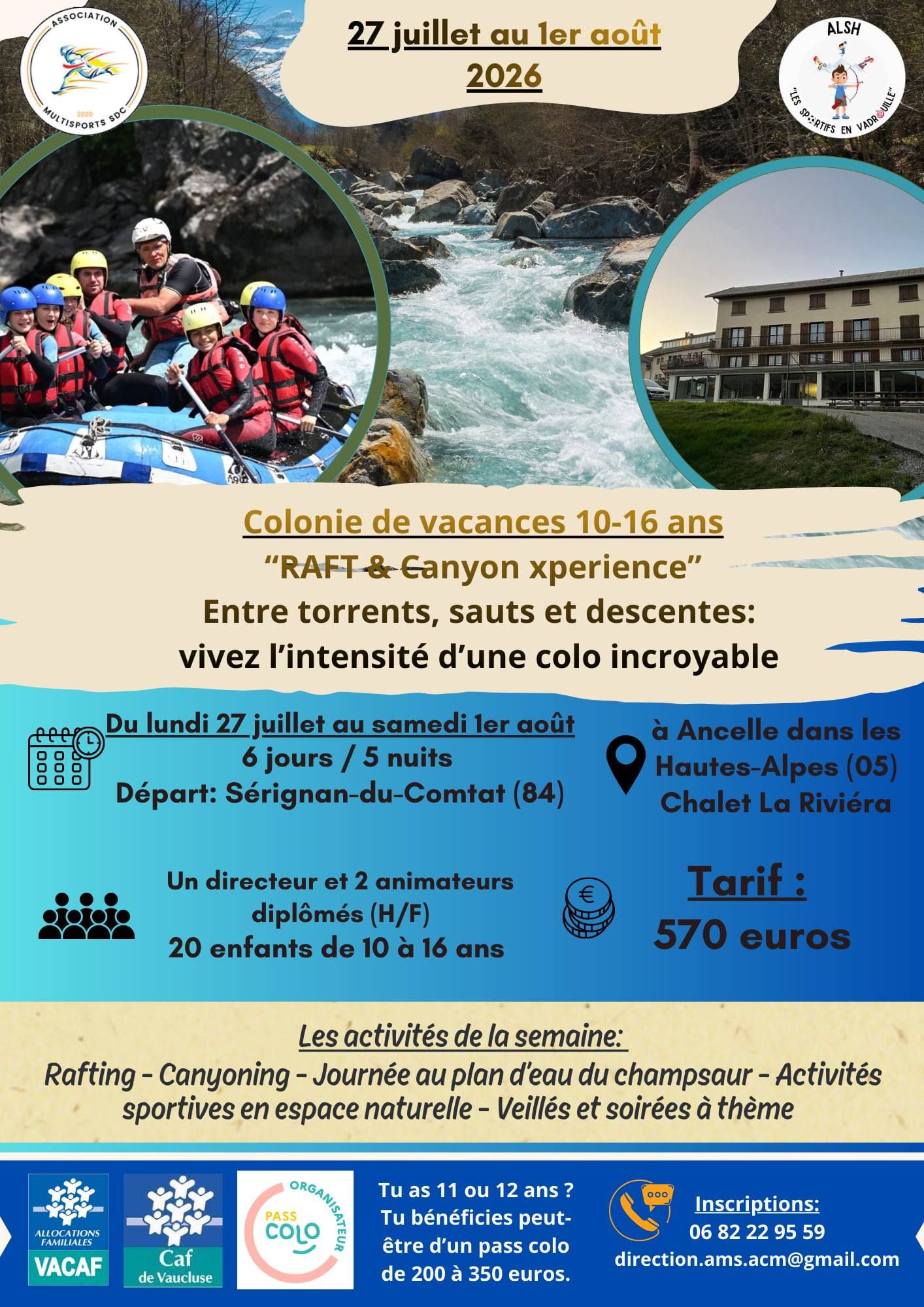 Du lundi 27 au samedi 1er août 2026 pour les enfants de 10 à 16 ans.