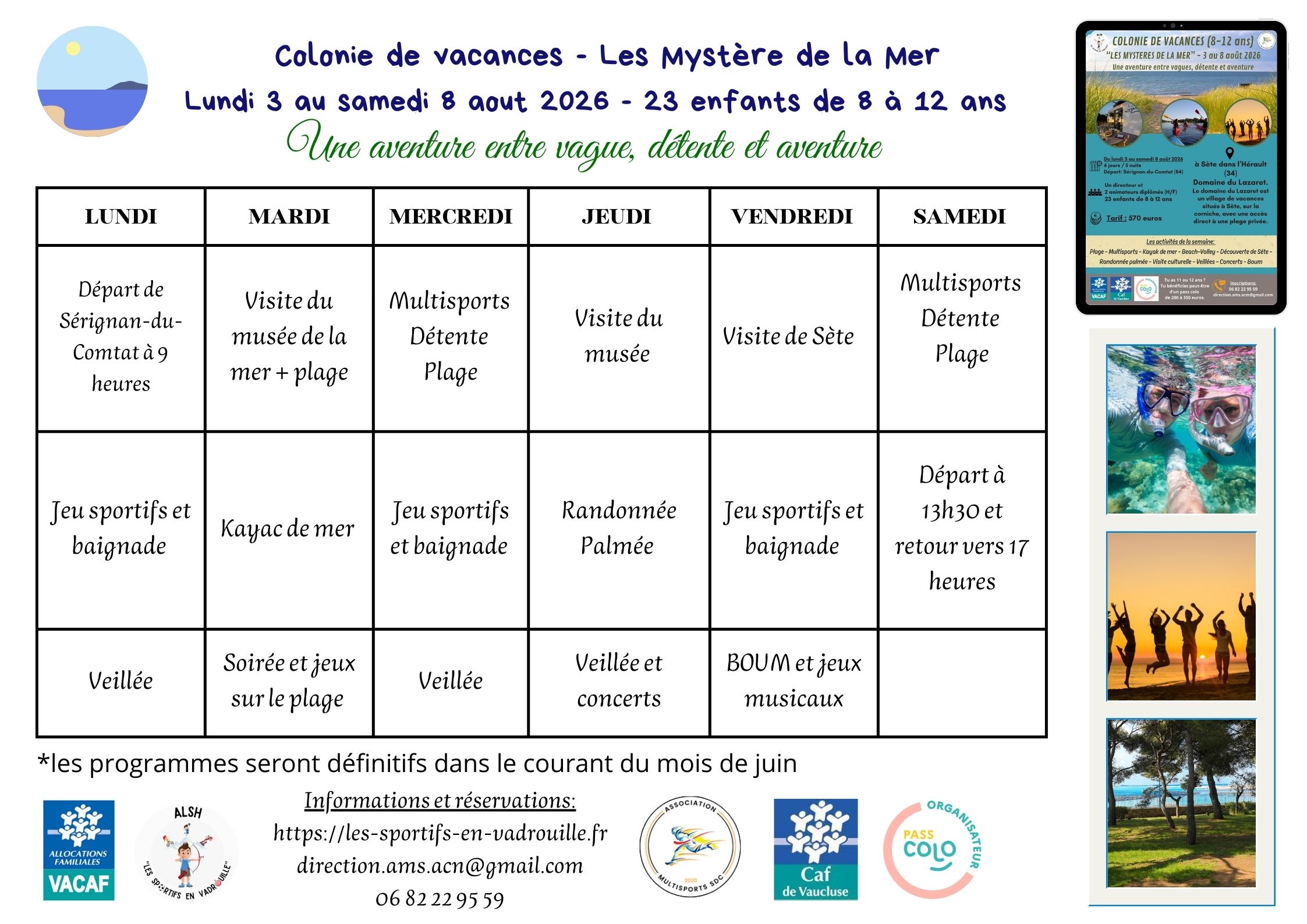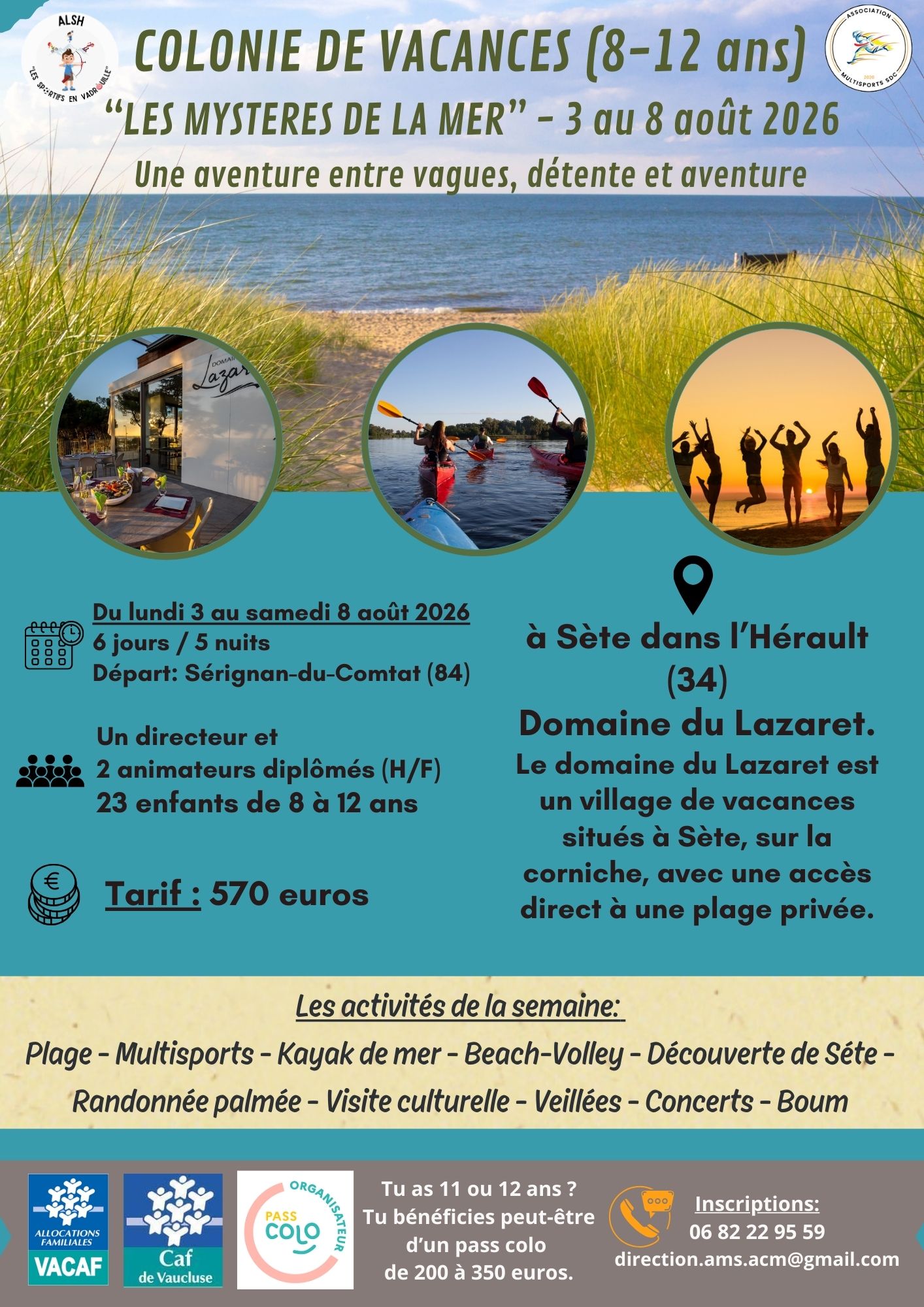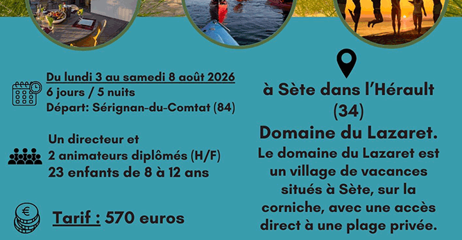Du lundi 3 au samedi 8 août 2026 pour les enfants de 8 à 12 ans.